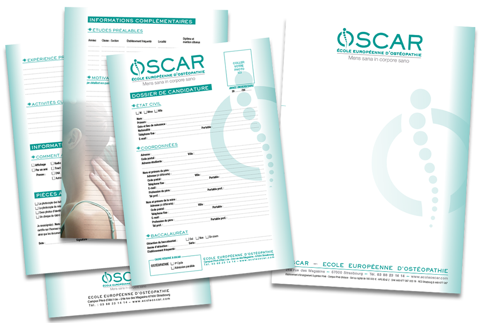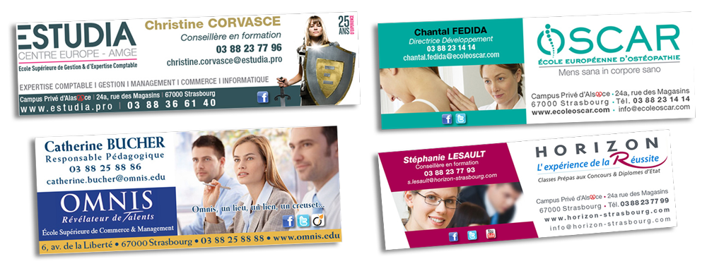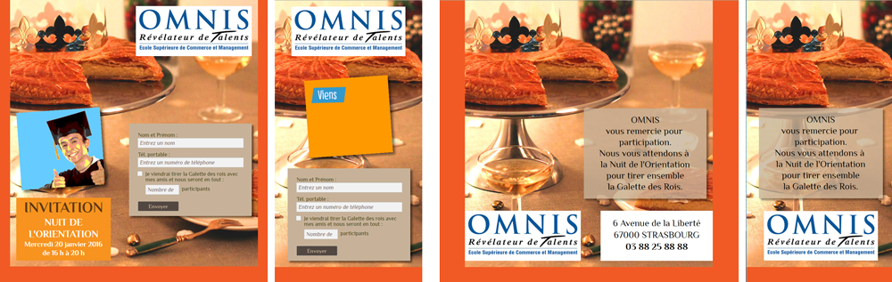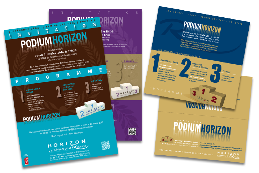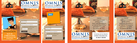 Invitation papier et emailing. La structure globale est gardée, seule les couleurs changent à chaque session.