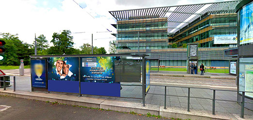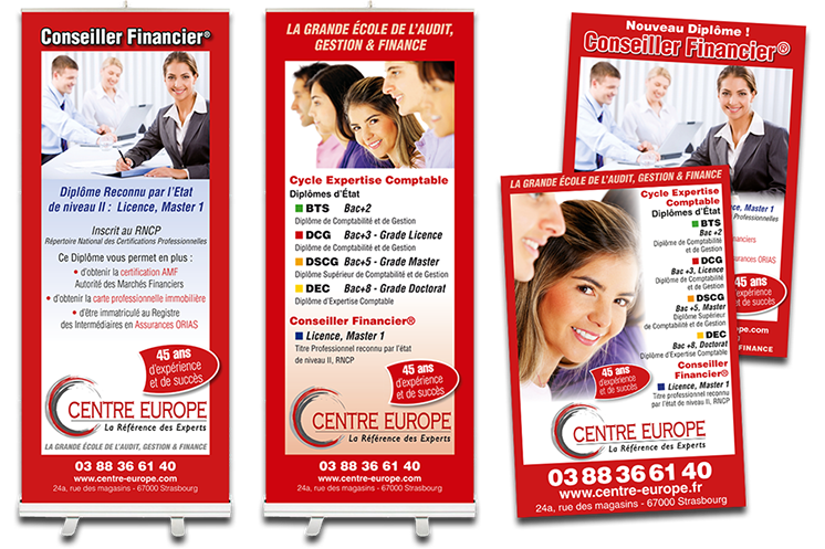 Rollup, bâche Tour de table pour salon/expos, Plaquette de tarifs, Carte de visite R/V.